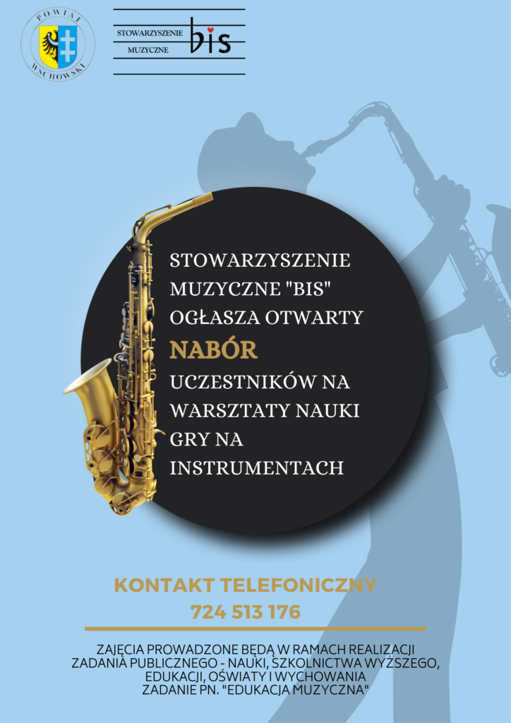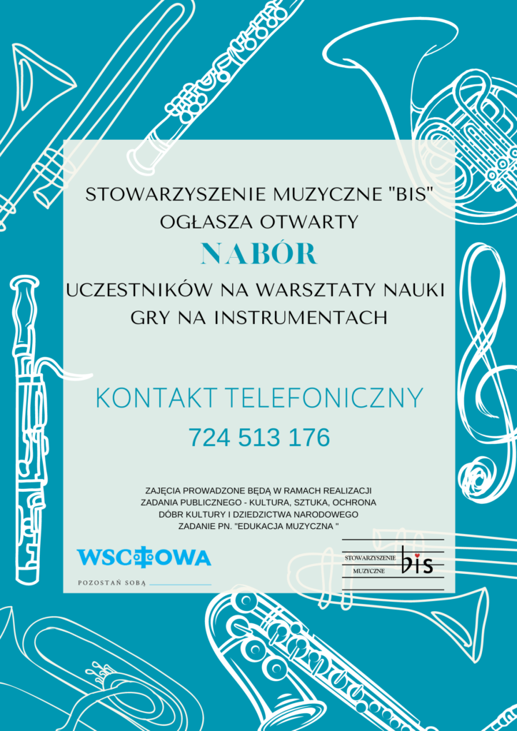 „Edukacja muzyczna” zadanie to również polega na udzielaniu nieodpłatnych lekcji gry na wybranym instrumencie. Zachęcamy do zgłaszania się. Rekrutacja rozpoczęta, potrwa do końca kwietnia 2023. Kwota dofinansowania to 2 000,00 zł.