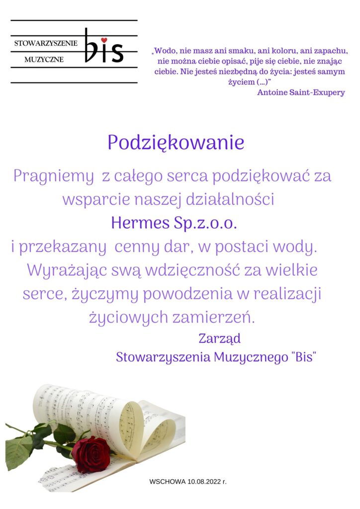 Pragniemy poinformować o kolejnym Darczyńcy, który wsparł działania Stowarzyszenia Muzycznego „Bis”. W związku z wyjazdem Orkiestry MAESTOSO CKiR Wschowa do Francji, zwróciliśmy się z prośbą do Firmy HERMES z Włoszakowic o przekazanie wody. Nasza prośba została pozytywnie rozpatrzona i następnego dnia odebraliśmy z Włoszakowic 240 butelek 1,5 litrowej wody średni gaz oraz 100 butelek 0,5 l niegazowanej wody. W upały, które towarzyszą nam tego lata, dar od Firmy Hermes z Włoszakowic ma szczególnie duze znaczenie. Dziekujemy bardzo!