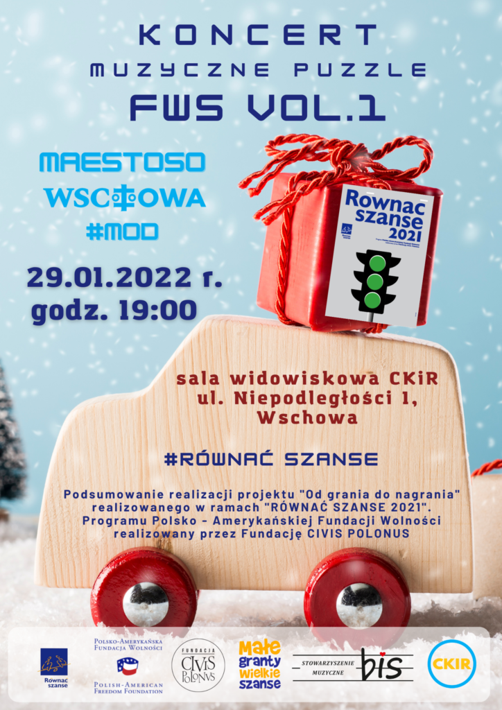 Zapraszamy na koncert Muzyczne Puzzle FWS vol.1 dnia 29.01.2022r. na godz. 19:00. Koncert odbędzie się w sali widowiskowej CKiR. Wstęp wolny!Koncert jest podsumowaniem realizacji projektu „Od grania do nagrania” realizowanego w ramach „RÓWNAĆ SZANSE 2021”. Program Polsko – Amerykańskiej Fundacji Wolności realizowany przez Fundację CIVIS POLONUS.Podczas koncertu będzie Państwo mogli wysłuchać utwory świąteczne, które znalazły się na naszej płycie wydanej dzięki realizacji tego projektu.Podczas koncertu uczestnikom projektu towarzyszyc będą członkowie Młodzieżowej Orkiestry Dętej CKiR Wschowa.