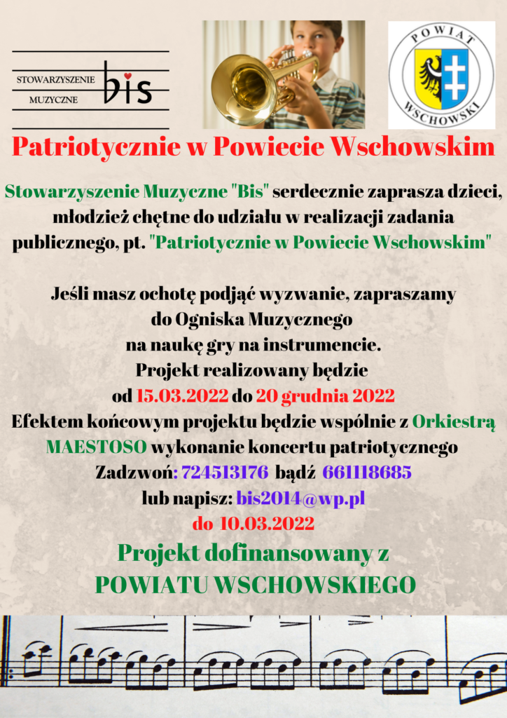 Stowarzyszenie Muzyczne „Bis” otrzymało dofinansowanie z Powiatu Wschowskiego na realizację zadania publicznego pt. „Patriotycznie w Powiecie Wschowskim” Kwota dofinansowania to 7000 zł.
