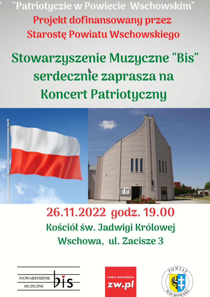 Zapraszamy serdecznie wszystkich mieszkańców Powiatu Wschowskiego na Koncert Patriotyczny, realizowany przez Stowarzyszenie Muzyczne „Bis”, dofinansowanego przez Starostę Wschowskiego.